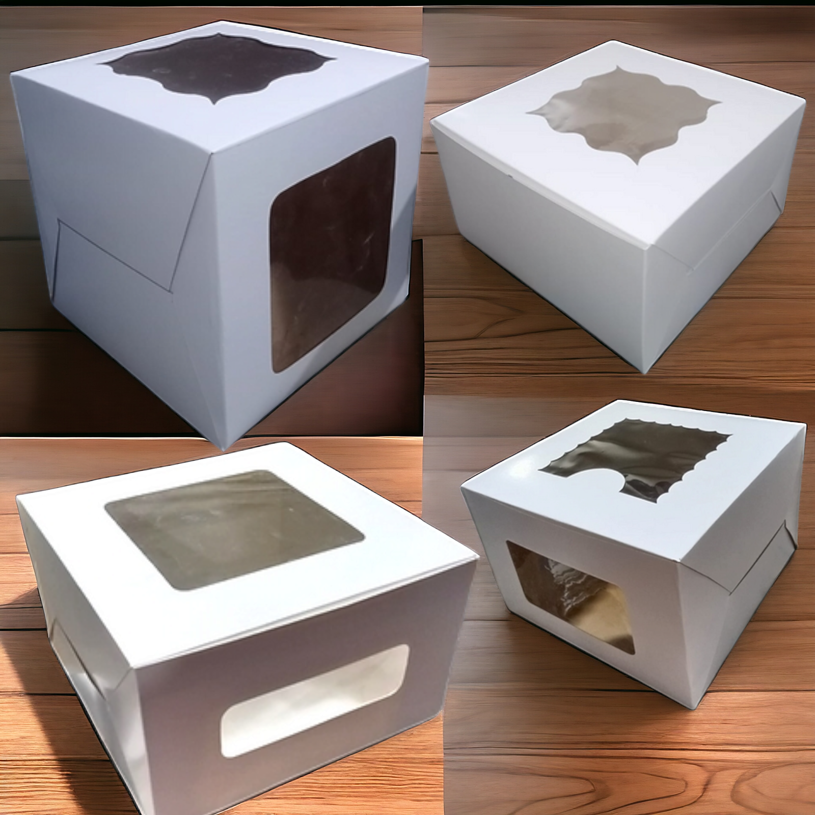 Sleek Design: A white cardboard cake box with a see-through window that enhances product visibility and appeal.